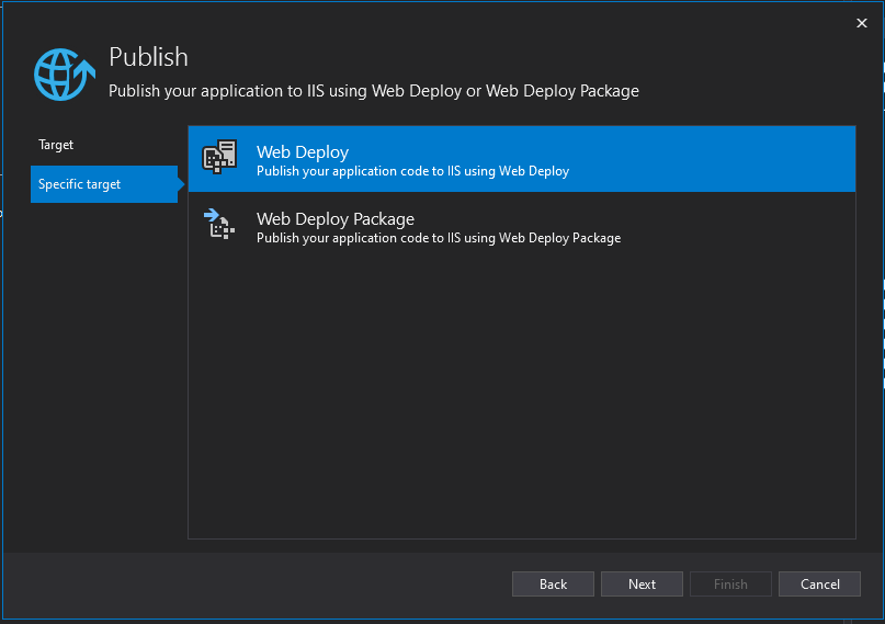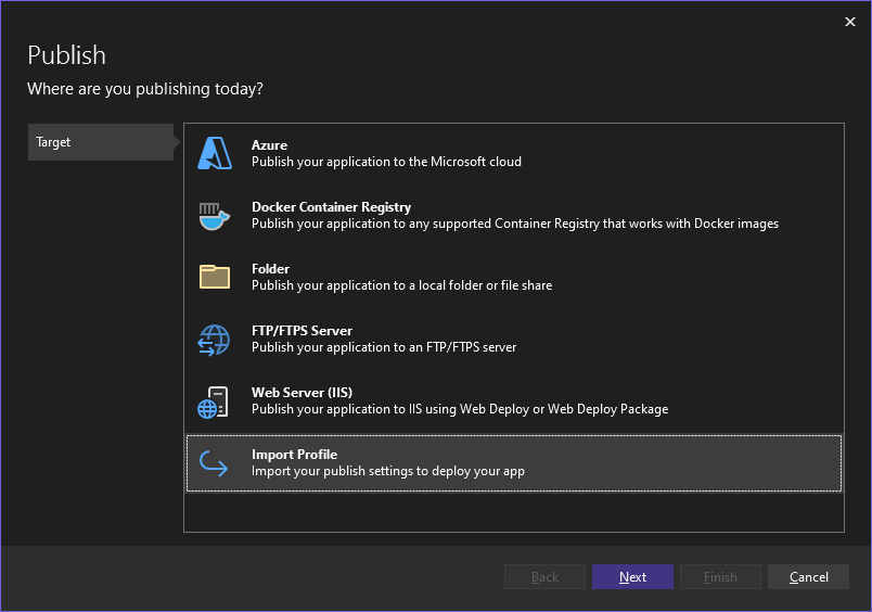 Birinci seçenek IIS üzeirnden oluşturduğunuz publish profile dosyasını import etmek;
