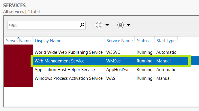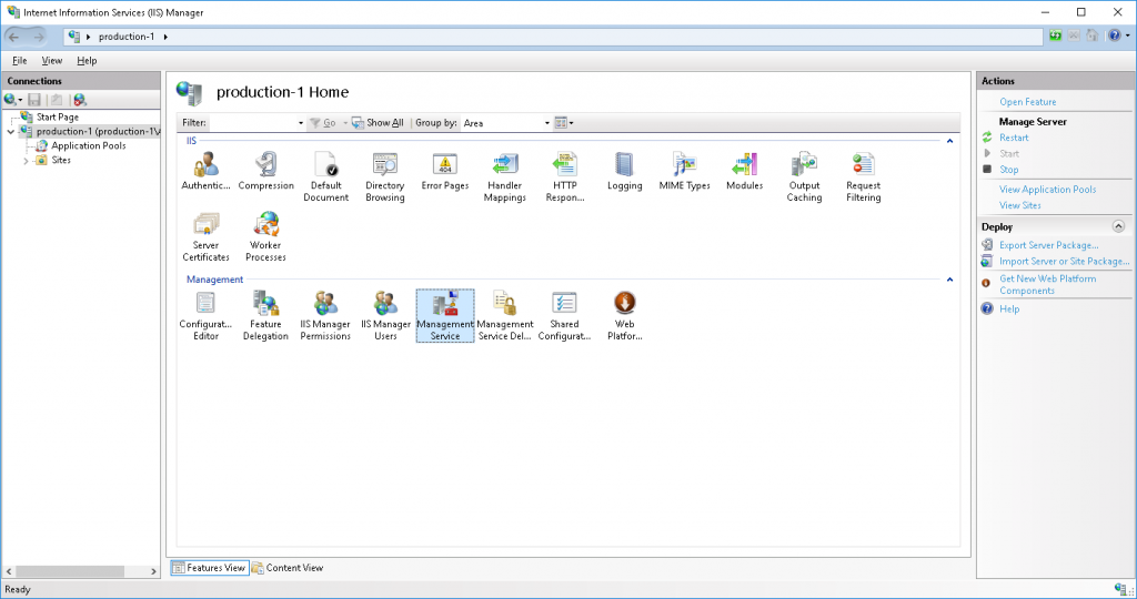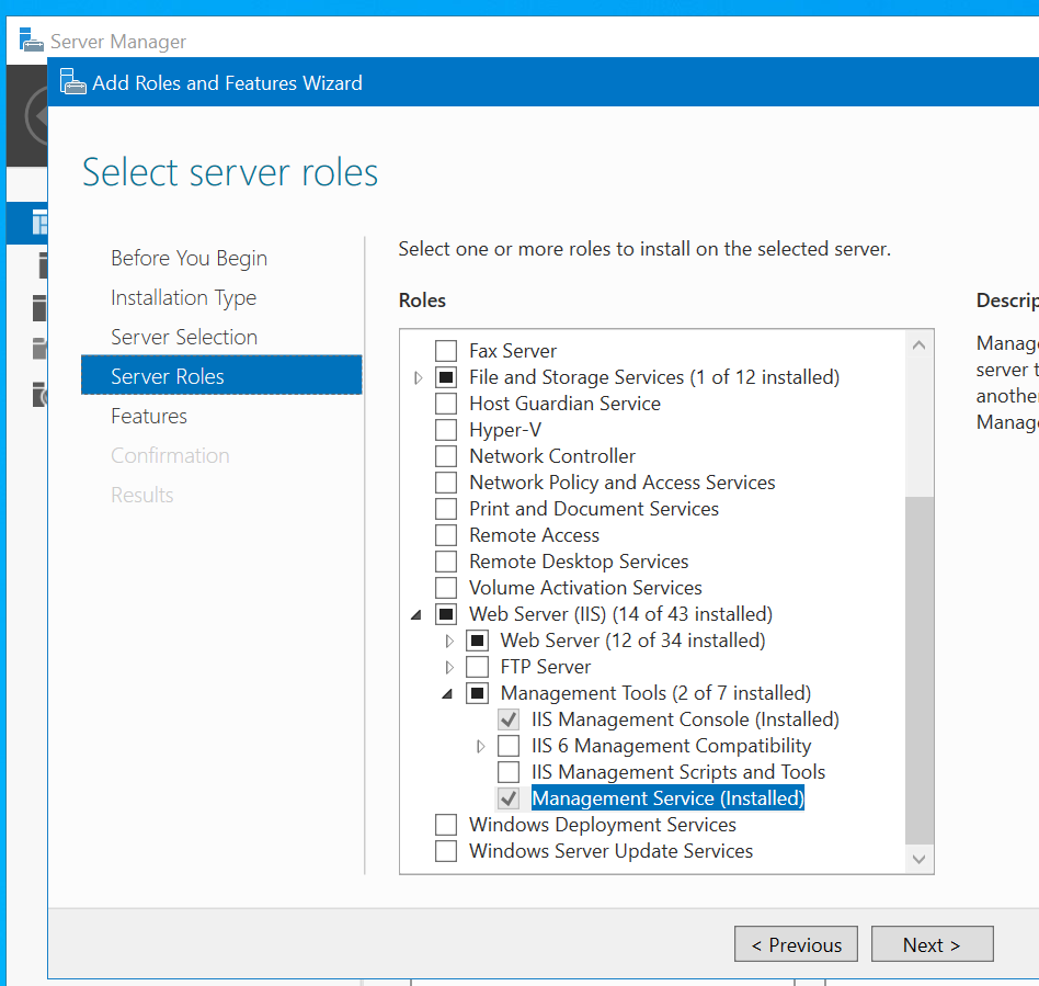 Öncelikle sunucu üzerinde Management Services role özelliklerinin sunucu üzerinde yüklü olduğundan emin olmalısız. Bunun için aşağıdaki adımda yer alan kutucuğun işaretli olduğunu teyit edin.Server Manager - Add Roles and Features - Server Roles - Web Server (IIS) - Management Tools - Management Service